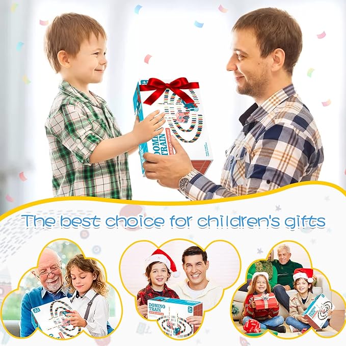 A fun and educational toy train that automatically sets up colorful dominoes as it rolls, sparking creativity, motor skills, and parent-child bonding.