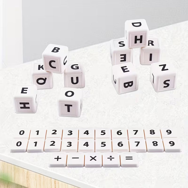 The Educational 2-in-1 Math & Word Matching Game helps children learn spelling and simple arithmetic using matching cards, letter cubes, numbers, and symbol blocks for interactive learning 🧠✨.